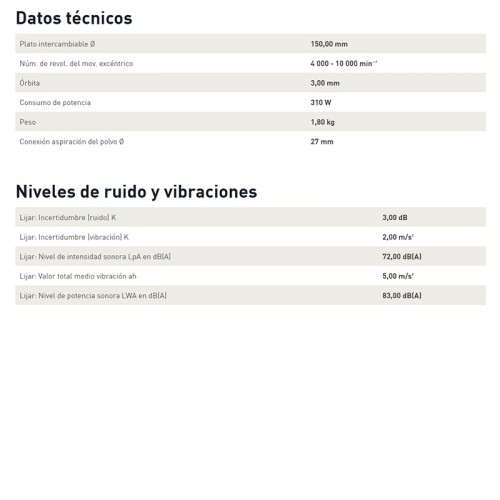 La lijadora excéntrica ETS 150/3 de Festool está especialmente pensada para el lijado fino y extrafino de pinturas, madera y plásticos. Su ligereza y su diseño ergonómico, capaz de adaptarse a la mano, permiten trabajar sin esfuerzo tanto en superficies horizontales como verticales. Su sistema electrónico MMC (Multi Material Control) permite regular y mantener constantes las revoluciones y temperatura durante el lijado y en función del material. La órbita de 3mm permite conseguir un perfecto acabado de la superficie. Todo esto junto con su potente sistema de aspiración de polvo, hacen de esta lijadora la mejor candidata para trabajar de manera segura y obteniendo los mejores resultados.